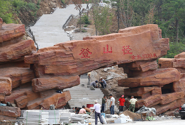通往觀景臺的是一條長達1039米的登山徑,登山徑自下而上觀望,給人以高聳入云之感,登山徑的主體現已完工,但在現場依然還能看到一群手持精密儀器的測量人員和工程技術人員一直在這里認真工作。他們是為了登山徑兩側的排水工程、電氣工程及綠化裝飾工程做著最后的測量,以確保工程質量。