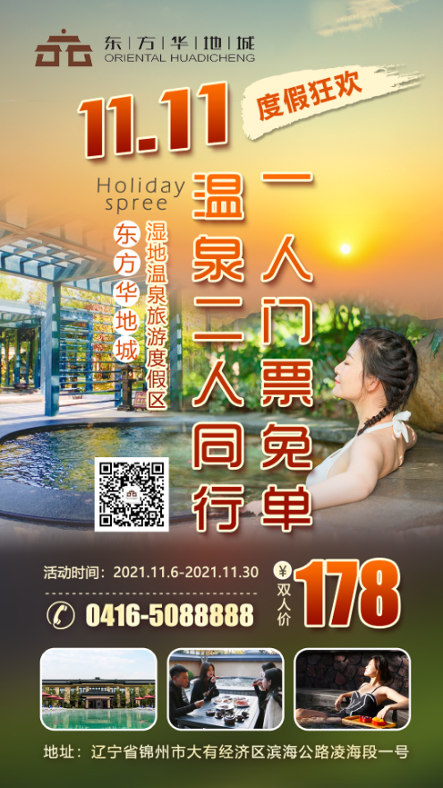 在此次雙十一狂歡節(jié)期間,凡關注“東方華地城濕地溫泉旅游度假區(qū)”微信公眾號并轉發(fā)活動文章到朋友圈累計三天,即可享受溫泉門票二人同行,一人免單的超值優(yōu)惠。