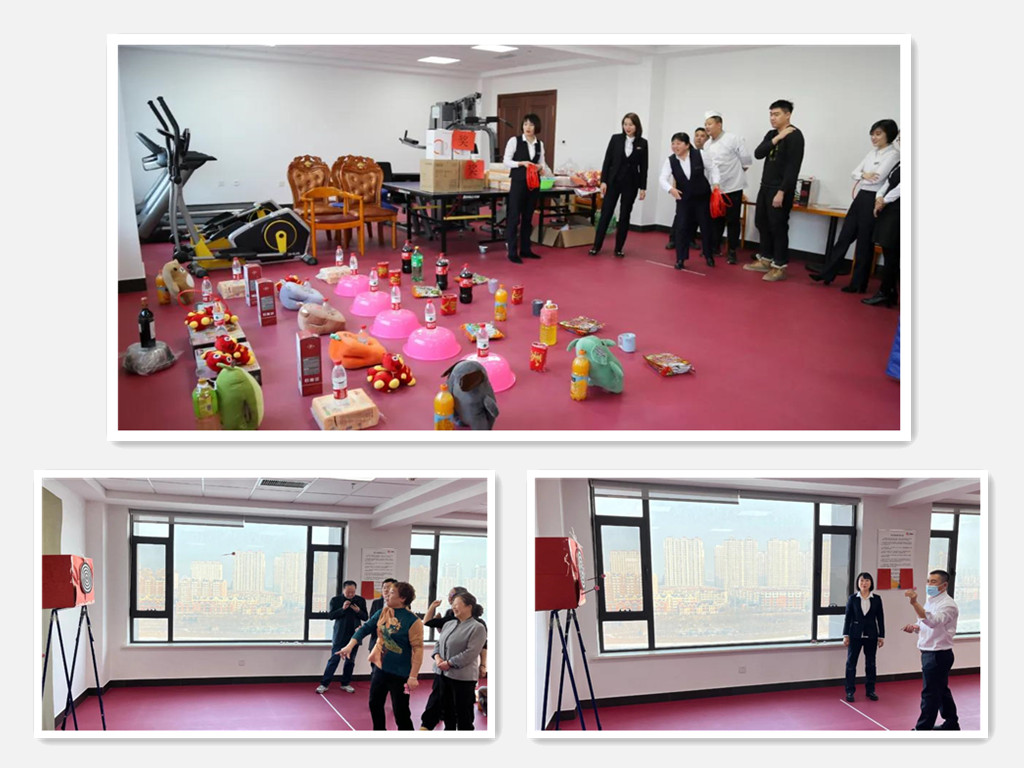 套圈活動(dòng)現(xiàn)場,福字、春聯(lián)、飲料、保溫杯、抱枕、餐具套裝等等,還有價(jià)值2000元的紅酒,隨著一聲聲歡呼,參加活動(dòng)的同事滿臉笑容的一堆堆套走。飛鏢靶前,屏氣凝神,大家為投手吶喊助威。