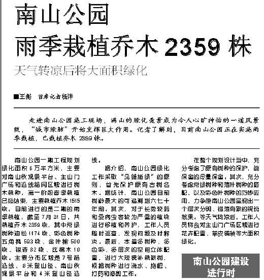 走進(jìn)南山公園施工現(xiàn)場(chǎng),滿山的綠化美景成為令人心曠神怡的一道風(fēng)景線,“城市綠肺”開(kāi)始發(fā)揮巨大作用。記者了解到,目前南山公園正在實(shí)施雨季栽植,已栽植喬木2359株。